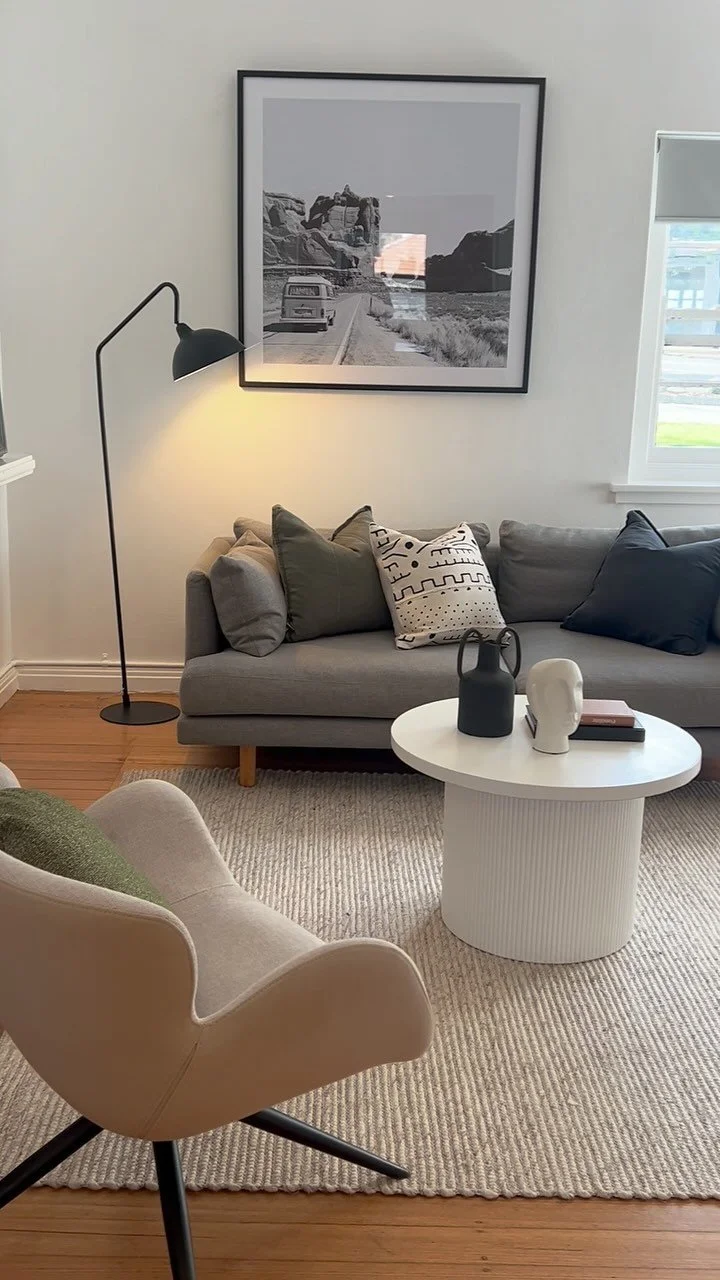 The limitations of this property was the stairs. Creating a usable space that buyers could envisage living in and entertaining was of our upmost importance. We choose a large contemporary four seat sofa with two oversized arm chairs. ‘